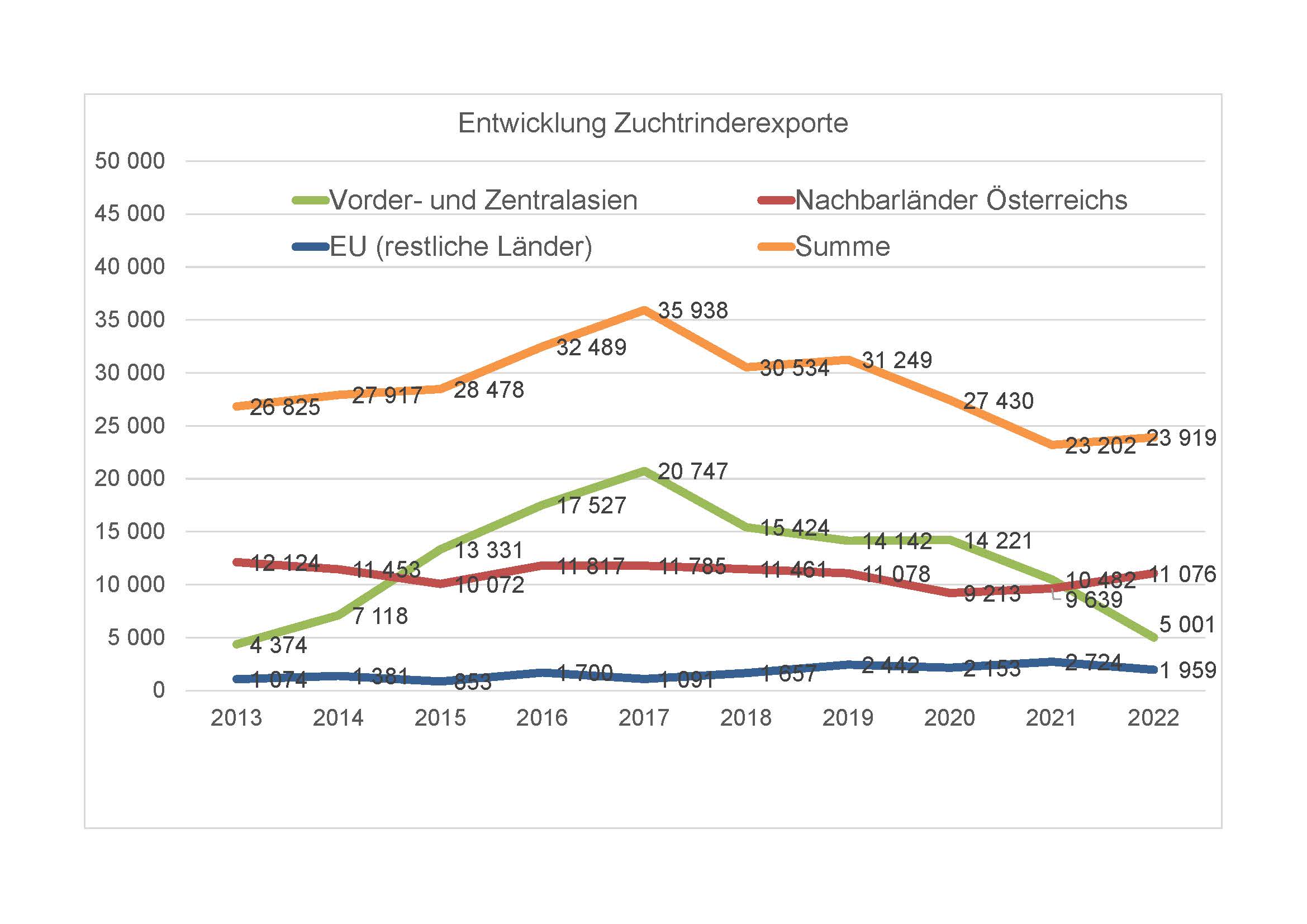 Im Jahr 2022 wurden 23.919 Zuchtrinder exportiert, um 717 Stk. oder 3,1 % mehr als im Vorjahr. Davon wurden 55 % innerhalb der Europäischen Union vermarktet, die restlichen 45 % nach Drittländern. Italien ist jenes Land mit den meisten importierten österreichischen Zuchttieren. Das Land ist schon seit jeher ein wichtiger Handelspartner der heimischen Rinderwirtschaft und Rinderzucht. Allein 6.000 Stk., das sind ein Viertel aller Tiere, wurden über kürzeste Transportwege dorthin geliefert.